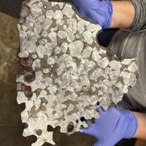 Dronimo Miteorite is named after the village in which it was found by a mushroom collector. Scientists after embarked on an exploration of the area and 600 fragments were recovered. It is thought due to the distribution of fragments found that the meteorite impact formed a now-buried crater. Unlike most iron meteorites, Dronimo Miteorite does not display a widmanstatten pattern when etched. Rather, it reveals remarkable iron sulfide inclusion with an ameboid shape on a mirror fishing background. Full individuals are gnarled and are a clear reminder of their extraterrestrial origin!.